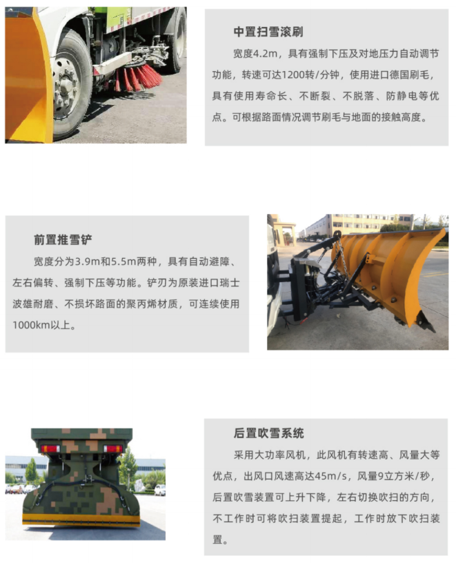 其他說(shuō)明:HQ-550ZHCXC大型綜合除雪車,是一種三合一多功能除雪車,具有“前推、中掃后吹及輔助盤掃”的功能。同時(shí)具有效率高、除雪質(zhì)量好、能耗低等優(yōu)點(diǎn),除凈率可達(dá)98%以上。可以做到環(huán)保物理清雪。