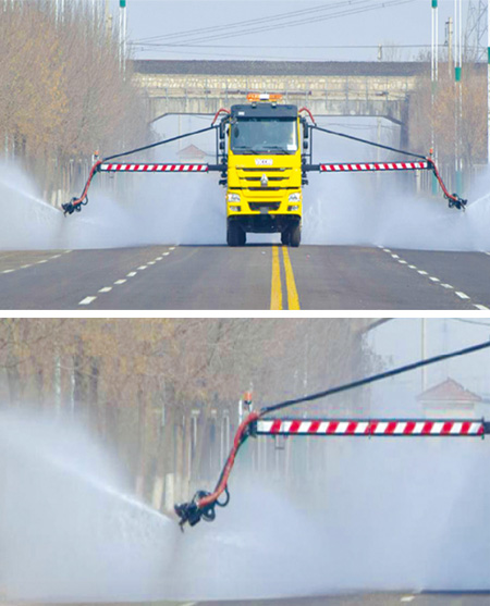 其他說明: 具有五種及以上撒布模式,車輛兩側(cè)噴灑桿展開后最大撒布寬度:24米;滿載除冰液時在30克/平方米噴撒作業(yè)時,一次性噴撒酒跑道長度16000米。噴水嘴數(shù)量:后部中間5嘴,后部兩側(cè)每側(cè)6嘴,左右伸展臂端部每側(cè)6嘴。噴灑桿通過駕駛室中的控制盤控制噴灑桿的展開或收回,其外端能夠通過控制盤按鍵進行液壓提升;所有操作可在駕駛室完成,單位面積噴灑劑量設(shè)定后在不同工作速度時保持恒定;為保證除冰液噴灑均勻,可自動調(diào)節(jié)噴灑寬度和噴撒量;噴灑臂桿位于駕駛室后方并具有防碰撞保護裝置;噴灑桿擺臂的收攏及展開止點位置設(shè)有傳感器檢測裝置。