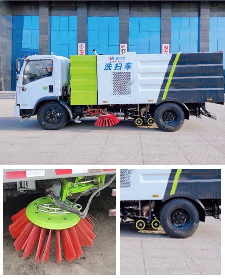 小石塊等均能一次抽吸干凈。該車除具備掃路車必備的掃刷及吸口、吸管降塵外,還為沙塵較多地區(qū)清掃用于壓塵的自流噴嘴,此噴嘴只在揚(yáng)塵較為嚴(yán)重時(shí)該水路打開以增加吸口吸管的噴水量,提高降塵效果,以避免吸管粘堵。